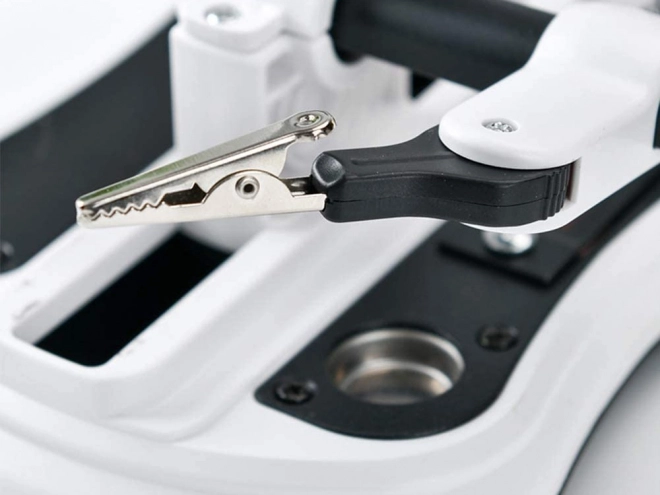 Nastavljive roke s čvrstimi krokodil sponkami fiksirajo dele v idealnem položaju. Spiralno držalo za spajkalnik in čistilec konice pospešita in izostrita delo.