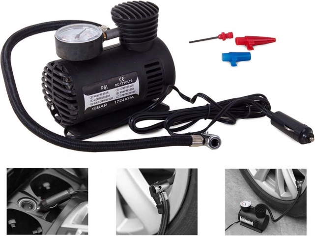 Paket vsebuje kompresor s cevjo, vtič za vžigalnik, manometer in komplet nastavkov za različne potrebe.