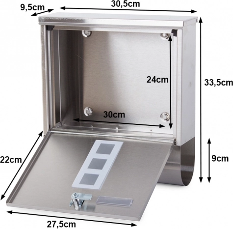 Med ostalimi prednostmi so dodatna posoda za časopise in tri prozorne odprtine, ki omogočajo enostaven pregled vsebine nabiralnika. Paket vključuje tudi okence za naslove za nameščanje osebnih sporočil.