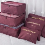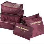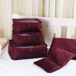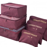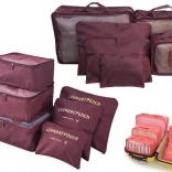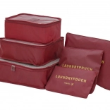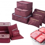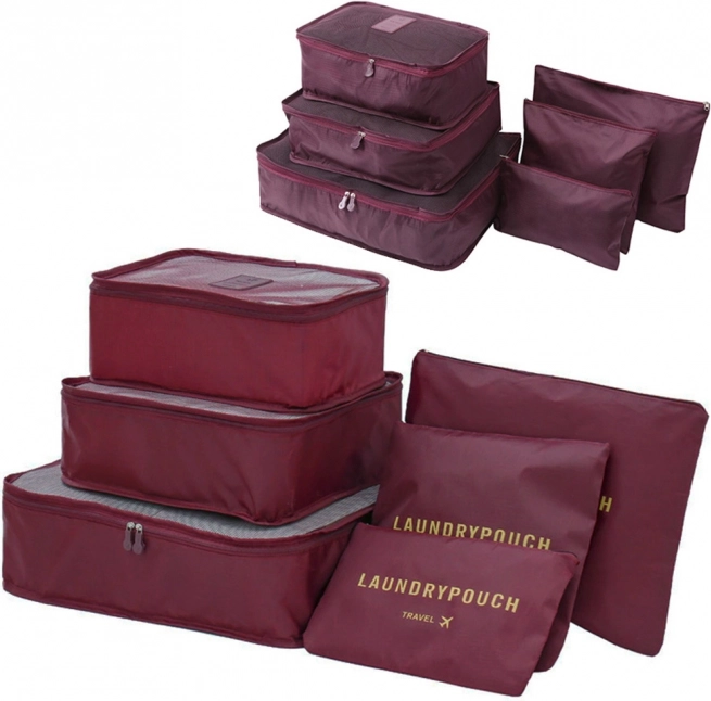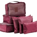 Praktičen set 6 potovalnih organizatorjev za pregledno pakiranje oblačil, spodnjega perila, obutve in kozmetike. Trije večji kubusi z mrežastim zgornjim delom in dvosmerno zadrgo omogočajo kroženje zraka in hiter dostop, manjši neprozorni žepi z zadrgo pa so idealni za perilo za pranje in drobnarije. Lahka, trpežna in enostavna za čiščenje, v elegantni bordo barvi.