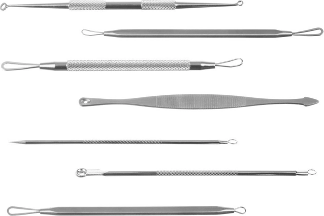 Ta praktični komplet vsebuje 7 dvostranskih komedonskih orodij (skupaj 14 delovnih konic) za nežno in natančno čiščenje kože. Večje zanke pomagajo pri mozoljih in belih ogrcih, manjše zanke in konice so idealne za črne ogrce na težje dostopnih mestih. Nerjavno jeklo je trpežno, higiensko in ga je enostavno sterilizirati.