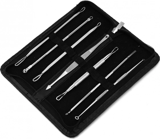 Profesionalni komplet 7 dvostranskih orodij za odstranjevanje črnih in belih ogrcev ter mozoljev. Iz higienskega nerjavnega jekla z nedrsečimi ročaji, enostavno za razkuževanje in prenašanje v kompaktni etui z zadrgo.
