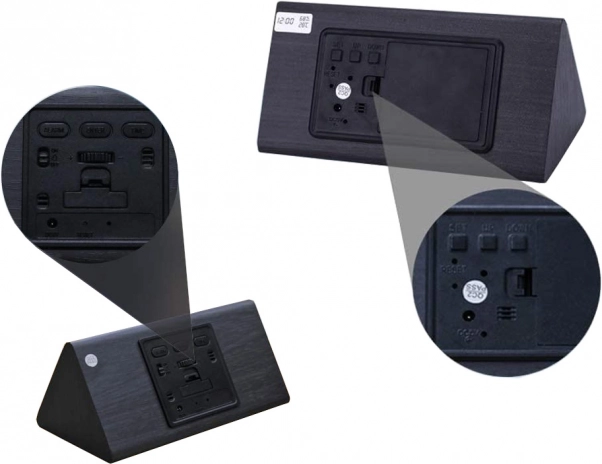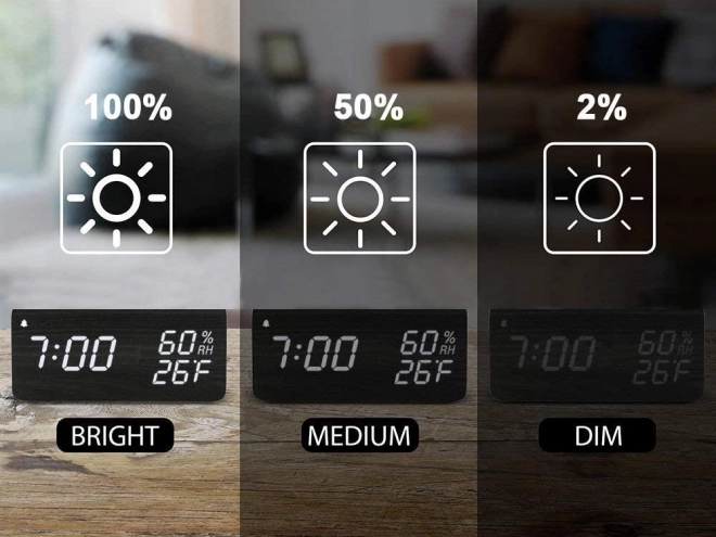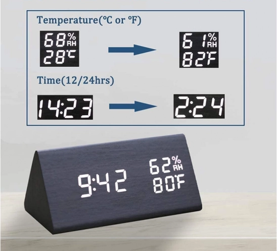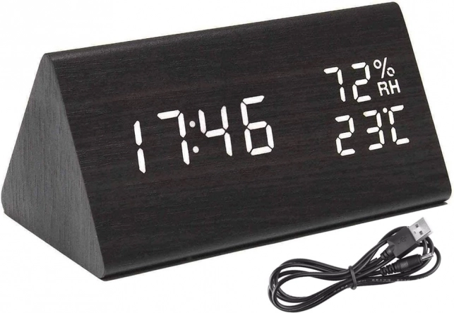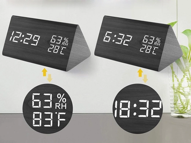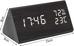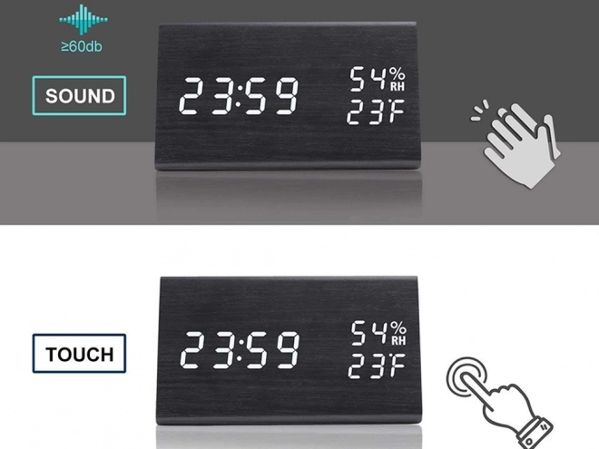 Dizajnerska namizna ura z učinkom črnega lesa se odlično poda v spalnico, dnevno sobo ali pisarno. Večfunkcijski zaslon prikazuje čas, datum, temperaturo (°C/°F) in vlažnost. Zahvaljujoč zvočnemu upravljanju se zaslon v varčnem načinu vklopi s ploskom ali potrkanjem, kar je idealno zlasti ponoči.