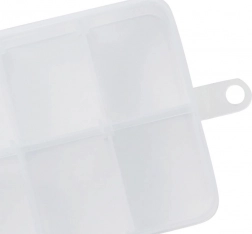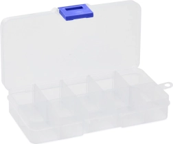 Modularna zasnova omogoča nastavitev najmanj 4 in največ 10 predelkov – posamezne vložke preprosto odstranite ali dodate. Prozorna izvedba zagotavlja hiter pregled nad vsebino, medtem ko tesno prilegajoč zatič zanesljivo drži pokrov med prevozom.