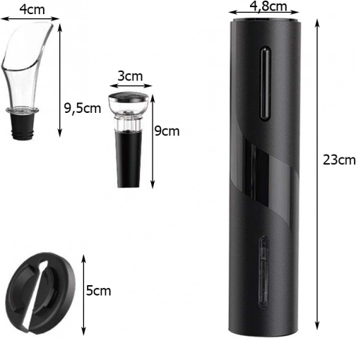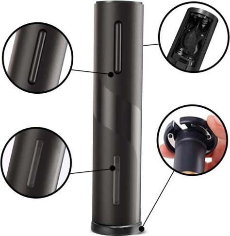 Brez lomljenja plutovin in napora z ročnimi odpirači. Električni odpirač za vino odpre steklenico v 5–7 sekundah z enim samim pritiskom na gumb. Prosojna komora omogoča spremljanje izvleka zamaška, elegantna črna izvedba pa se odlično poda vsaki kuhinji ali domači vinoteki.