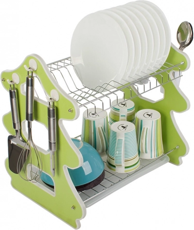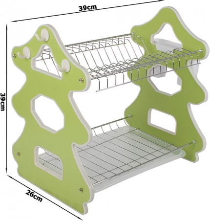 Elegantno dvonadstropno stojalo za sušenje posode je idealno za majhne in prostorne kuhinje. Zgornja polica sprejme do 14 krožnikov, spodnja je namenjena za sklede, skodelice in kozarce. Stranski organizator za pribor lahko namestite kjerkoli ob obodu, tri praktične kljukice pa služijo za krpe ali kuhinjski pribor.