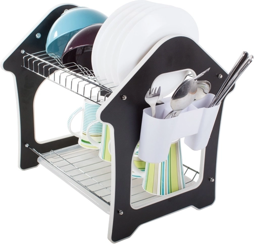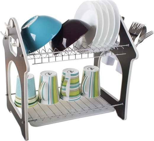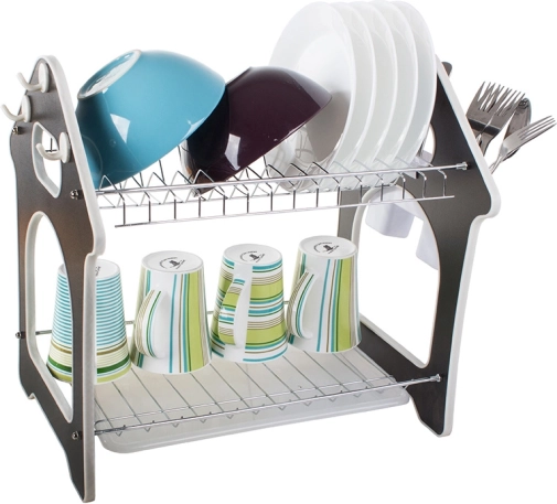 To dvonivojsko stojalo za sušenje posode učinkovito izkorišča vertikalni prostor in sprejme do 14 krožnikov na zgornji polici, medtem ko je spodnja polica idealna za sklede, skodelice in kozarce. Priloženo je odstranljivo držalo za jedilni pribor, ki ga lahko namestite na katerokoli stran, ter trije kavlji za obešanje kuhinjskih pripomočkov.