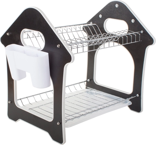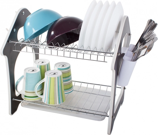 Praktično dvostopenjsko odcejalno stojalo za posodo s pladnjem za zbiranje vode, držalom za jedilni pribor in tremi kavlji za kuhinjske dodatke. Ponuja veliko kapaciteto, vzdržljivo kovinsko-plastično konstrukcijo in stabilno osnovo, ki ščiti delovni pult pred vlago. Slogovno hišasto oblikovan dizajn se odlično poda vsaki kuhinji.