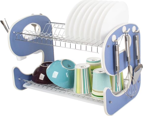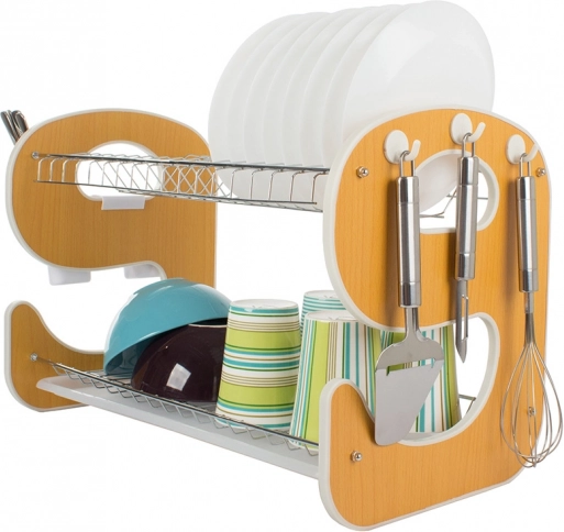 Praktično dvonadstropno odcejalno stojalo za posodo z odcejalno posodo bo vašo kuhinjo ohranilo v popolnem redu. Ponuja stabilno konstrukcijo, kapaciteto do 14 krožnikov, 2 ravni sušenja za krožnike, sklede in skodelice ter viseči organizator za pribor z kljukami za kuhinjske pripomočke. Kombinacija kovine in trpežne plastike zagotavlja dolgo življenjsko dobo in odpornost na vlago.