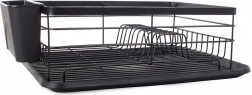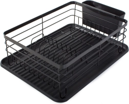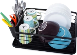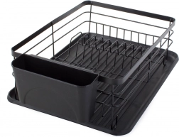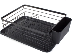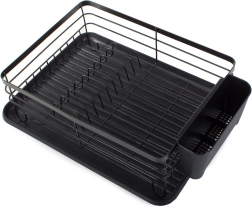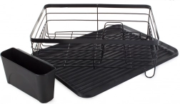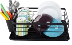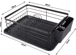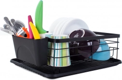 Ohranite kuhinjo čisto in pregledno z odkapljevalnikom za posodo s prostornim zbiralnikom. Stabilna kovinska konstrukcija s prašnim premazom je odporna na poškodbe in vlago, medtem ko plastična odkapna posodica zadržuje vodo in ščiti delovni pult. Del kompleta je tudi obešalni držalo za pribor, ki ga lahko namestite na kateri koli rob sušilnika.