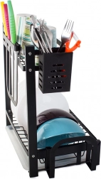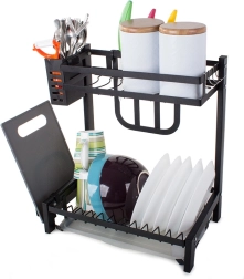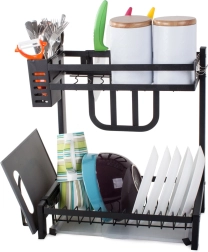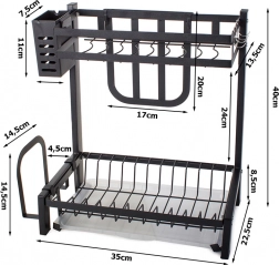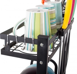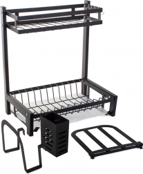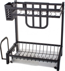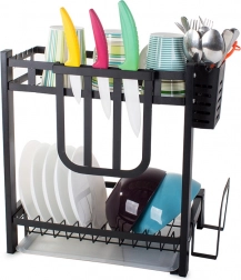 Ta odcejevalnik nudi veliko prostora za 11 krožnikov, sklede, lončke in kozarce. Opremljen je z visečim organizatorjem za pribor, posebnim organizatorjem za velike kuhinjske nože in polico za deske za rezanje, ki jo je mogoče pritrditi kjerkoli na okvir. Poleg tega ima 4 kljukice za kuhinjske krpe in večji kuhinjski pribor.