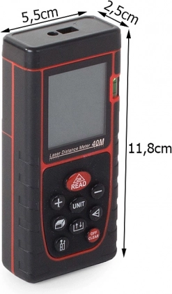 Digitalni laserski daljinomer je zasnovan za natančno merjenje razdalj s pomočjo laserske tehnologije. Njegov največji doseg je 40 metrov, kar ga naredi idealnega pomočnika za merjenje velikih prostorov, kot so zgradbe, vrtovi ali skladišča. Naprava je preprosta za uporabo in zaradi kompaktnih dimenzij jo zlahka pospravite v žep ali etui.