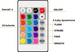 16 statičnih barv, FLASH, postopni prehodi 7 barv, samodejni način, regulacija svetilnosti, vklop/izklop