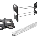Segmentna konstrukcija združuje kovinske (kromirane) cevi z vzdržljivimi plastičnimi stebri. V vsaki cevi so tri montažne odprtine, zato zlahka prilagodite višino polic za salonarje in superge. Regal je mogoče razširiti z dodatnimi nivoji – z združitvijo dveh kompletov podvojite kapaciteto. Montaža je hitra, pri razstavljanju pa zavzame minimum prostora.