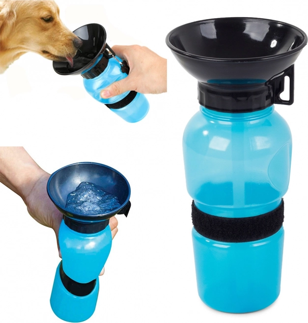 Praktična potovalna steklenica za pse z vgrajeno skledico za udobno pitje na poti. Dovolj je, da steklenico stisnete in voda se prelije v skledico. Zahvaljujoč nekapljajočemu zapiranju ne grozi iztekanje vode v nahrbtniku, s pritrjenim ročajem in trakom na ježka pa jo zlahka pripnete na pas ali nahrbtnik. Idealna za sprehode, pohode in potovanja v vročini.