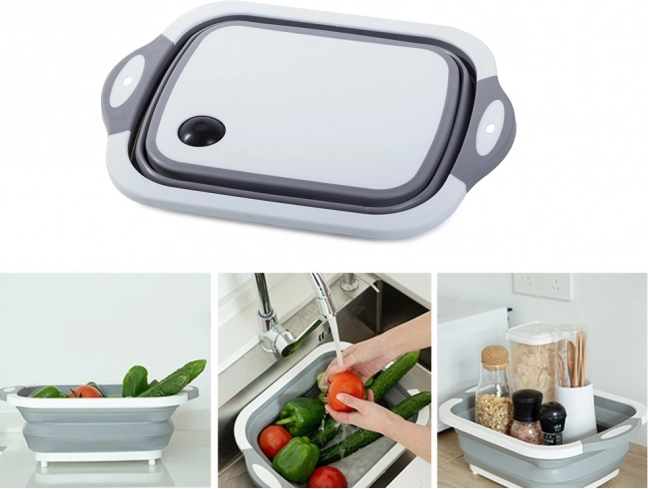 Odkrijte prednosti dvojne funkcionalnosti silikonskega odcejalnika, ki se v hipu spremeni v rezalno desko. Zložljiv dizajn omogoča enostavno shranjevanje in maksimalno praktičnost.
