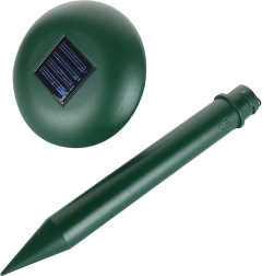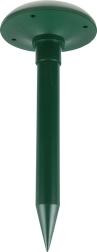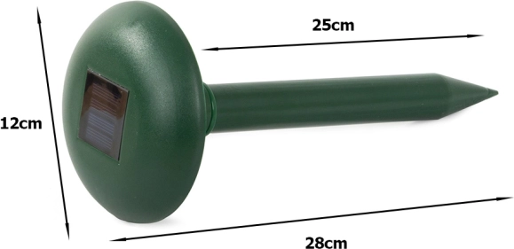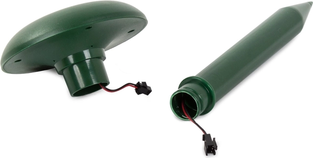 Odporen in zanesljiv skozi vse leto – robustna, vodoodporna zasnova zagotavlja delovanje v dežju, snegu in na soncu. Namestitev traja le nekaj sekund: zasunite v zemljo in končano. Prve dni se lahko aktivnost škodljivcev poveča, nato postopoma območje zapustijo.
