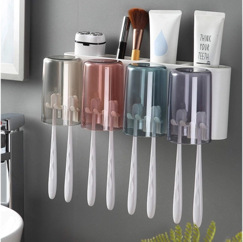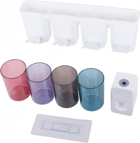 Stenski organizator za zobne ščetke z dozirnikom paste in 4 kozarčki