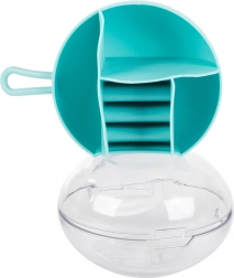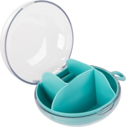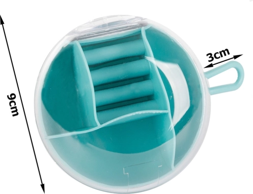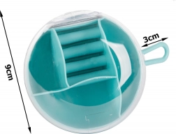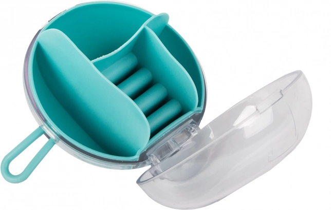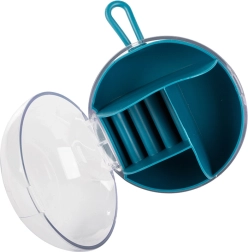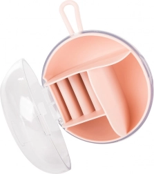 Zahvaljujoč odstranljivemu sredinskemu organizatorju lahko del predelkov uporabljate tudi samostojno. Kompaktne mere, premer 9 cm in višina 6 cm, ga naredijo za idealno izbiro za torbico, kovček ali toaletno mizico. Razpoložljive barve: rožnata, temno modra, zelena.