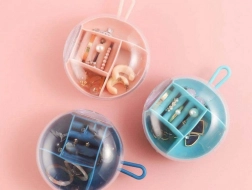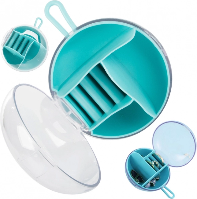 Ta elegantna potovalna škatlica za nakit pomaga, da so vaše dragocenosti na varnem in pregledno urejene. Okrogel etui iz trpežne plastike ima različne tipe in velikosti predelkov vključno z držali za prstane, zato ima vsak kos svoje mesto. Prosojen pokrov omogoča hitro preverjanje vsebine brez odpiranja, gumijasta zanka pa zagotavlja udobno nošenje.