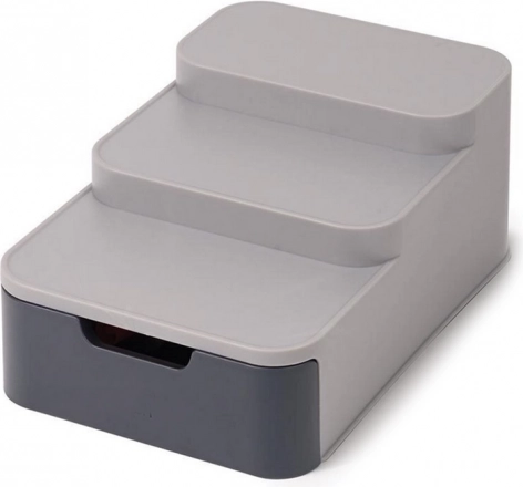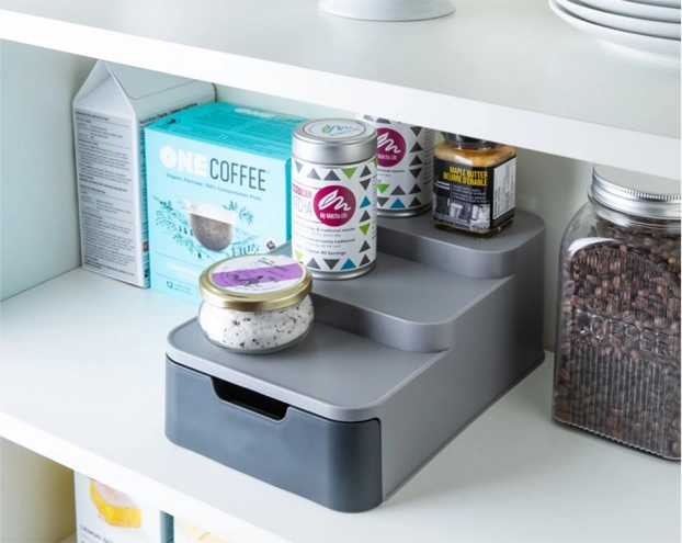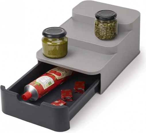 Ta kompakten organizator učinkovito izkoristi prostor v vaši shrambi ali omarici. Tri stopnje zagotavljajo boljšo vidljivost na kozarce in pločevinke v zadnji vrsti, medtem ko izvlečni predal sprejme vrečke, tube in druge drobnarije. Trpežen siv plastičen material se zlahka čisti in odlično pristaja sodobni kuhinji.