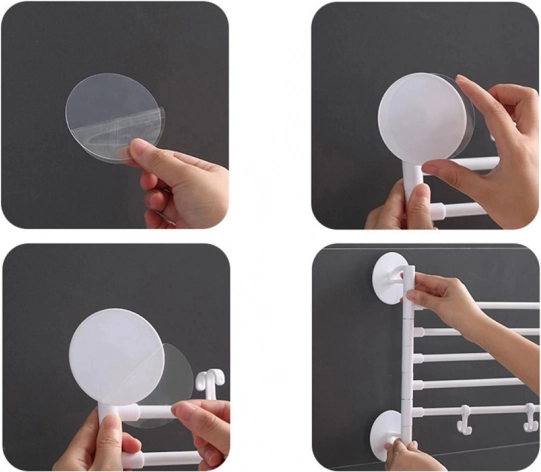 Namestitev je hitro opravljena in brez vrtanja – zahvaljujoč priloženim močnim samolepilnim blazinicam nosilec čvrsto prilepi na gladke površine, kot so ploščice. Idealna rešitev za manjše prostore, kjer šteje vsak centimeter.