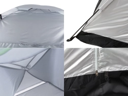 Zgornjo prezračevalno odprtino je v primeru dežja mogoče prekriti. Ojačano dno ščiti pred vlago iz tal, šotor pa enostavno pritrdite s pomočjo količkov. Po zlaganju zavzame minimalno prostora, zahvaljujoč prenosni torbi z ročajem pa ga zlahka odnesete.