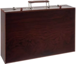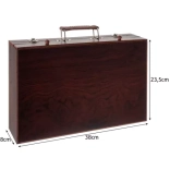 Zahvaljujoč praktičnemu lesenemu kovčku z ročajem in varnim zapiralom je prenašanje tega seta enostavno in udobno. Preko dobro organiziranih predalov boste vedno imeli preprost dostop do posameznih pripomočkov, ki bodo ostali urejeni in vedno pregledno organizirani.