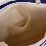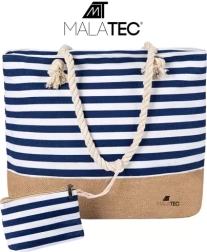 Uživajte dan ob vodi ali v mestu z univerzalno torbo, ki sprejme vse od brisače in kozmetike do knjig in malice. Spodnji del v jutenem videzu in modro‑bele črte poudarjajo trendy mornarski slog, primeren za plažo, piknik in vsakodnevno rabo.