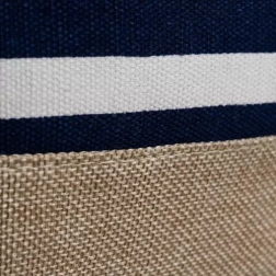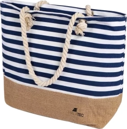 Modro‑bele črte in juten spodnji del ustvarjajo svež poletni videz. Močni vrvni ročaji zagotavljajo udobno nošenje tudi pri polni obremenitvi.