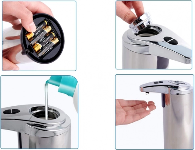 Za uporabo preprosto držite gumb za vklop dlje časa. Napajanje je omogočeno z štirimi AAA baterijami. Razpršilnik je idealen za razkužila zaradi brezkontaktnega sistema, ki zmanjšuje širjenje bakterij.