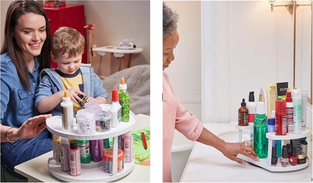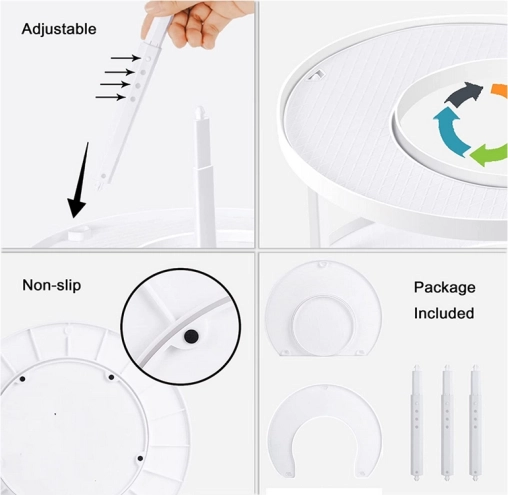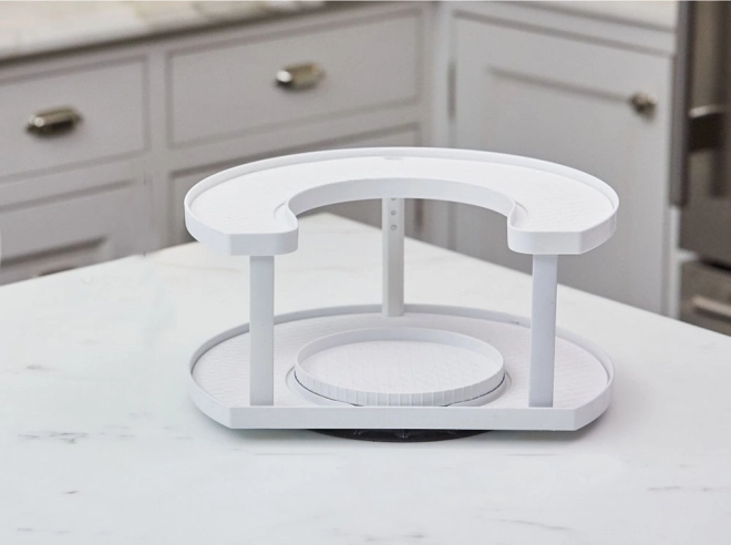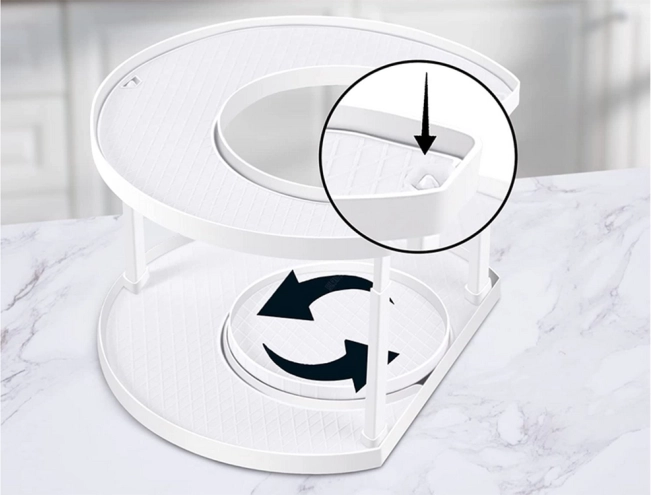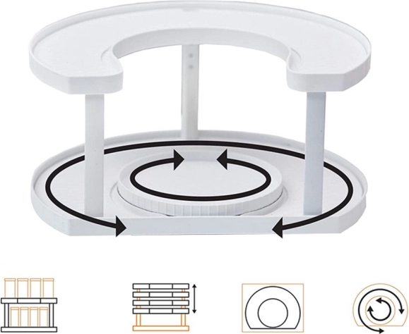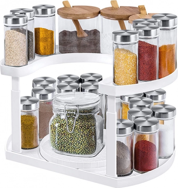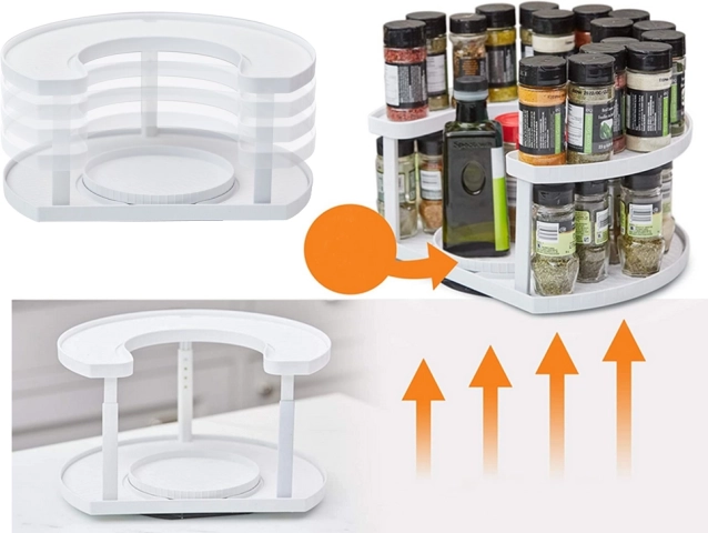 Ohranite kuhinjo urejeno s praktičnim, dvonadstropnim organizatorjem za začimbe z gladkim vrtenjem za 360°. Ponuja hiter dostop do vseh kozarčkov, nastavljivo višino in univerzalno uporabo v kuhinji, kopalnici in na toaletni mizici.