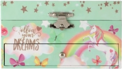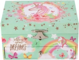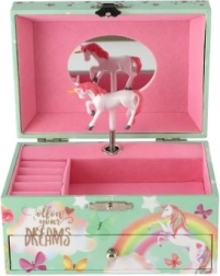 Ta stilska glasbena škatlica za nakit z enorogom je idealna za shranjevanje prstanov, uhanov in drobnih skrivnosti. Po odprtju pokrova z ogledalcem se po navijanju ključka zavrti belo-rožnati enorog in zazveni nežna glasba. Notranjost ponuja razdeljen prostor za nakit, spodnji predal pa sprejme dodatne dragocenosti.